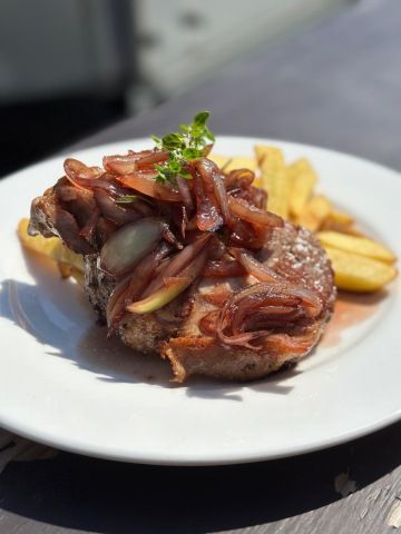 150g Trhané maso s čedarovou omáčkou, marinovná cibulka